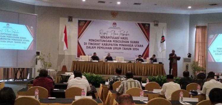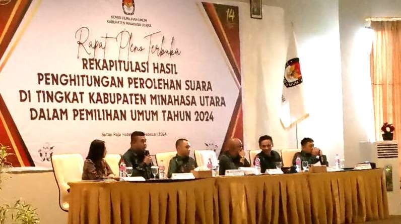 MINUT – Setelah tahapan Pemilu 14 Februari 2024 dan dilanjutkan dengan tahapan pleno kecamatan, Komisi Pemilihan Umum (KPU) Minahasa Utara (Minut) mengelar rapat pleno rekapitulasi hasil penghitungan perolehan suara tingkat Kabupaten, Selasa (27/2). di Sutan Raja Hotel Maumbi.