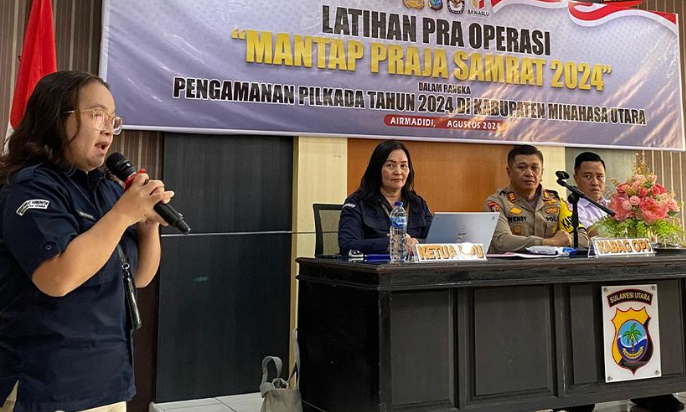 Komisi Pemilihan Umum Kabupaten Minahasa Utara (KPU Minut) Menjadi Narasumber di Kegiatan Latihan Pra Operasi Mantap Praja Samrat 2024 dalam rangka Pengamanan Pilkada Tahun 2024 di Kabupaten Minahasa Utara, Selasa (20/8/2024) bertempat di Polres Minahasa Utara, Airmadidi.