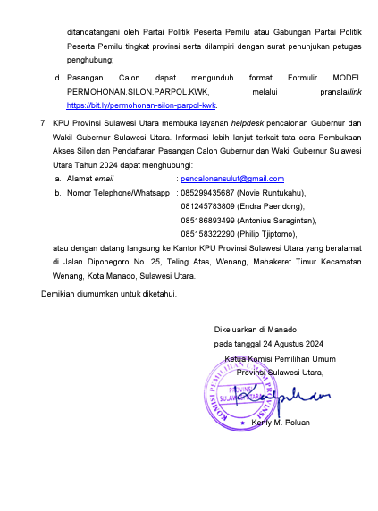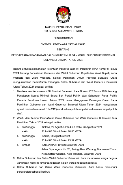 KPU Sulawesi Utara, Buka Pendaftaran Calon Pasangan Gubernur dan Wakil Gubernur Tahun 2024 Redaksi PolitBeritaAgustus 24, 2024September 6, 2024421 Dilihat Post Views: 421 Pos terkaitRUPS Luar Biasa, Kinerja BSG Moncer: Laba Rp281 M, Tetapkan Revino Pepah Dirut, Vicky Lumentut KomutDorong Pertumbuhan Ekonomi Lokal, CEP Berikan Bantuan Bagi Kelompok Usaha CateringBabak Baru Bank SulutGo: RUPS-LB Tetapkan Jajaran Komisaris dan DireksiTidak Hanya Hura-hura, Berry Fun Cs Launching Album Sambil Hijaukan LingkunganLaunching Album Perdana, Berry Fun Torehkan Sejarah di Skena Musik ReggaeTiga Tahun Konsisten Berinovasi, Bank SulutGo Tuai Prestasi Berkelanjutan Selama 2023 – 2025