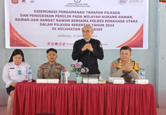 KPU Kabupaten Minahasa Utara melaksanakan kegiatan Diseminasi pengamanan tahapan pilkada dan pendidikan pemilih pada wilayah kurang rawan, rawan dan sangat rawan bersama polres minahasa utara pada Pemilihan Kepala Daerah Tahun 2024 kepada Tokoh Agama, Tokoh Masyarakat, Tokoh Pemuda dan Pemerintah , Di Kecamatan Airmadidi yg bertempat di Aula Kantor kelurahan Airmadidi Atas pada Rabu (18/09/2024).