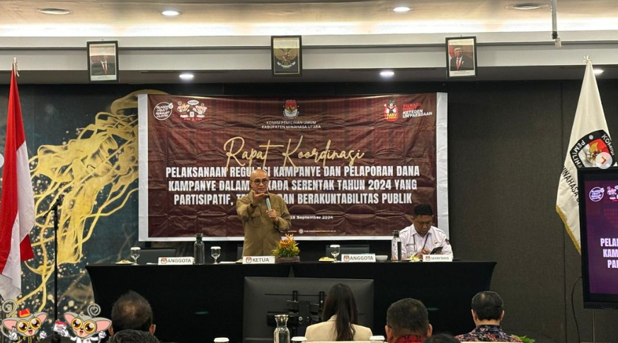 Komisi Pemilihan Umum Kabupaten Minahasa Utara (KPU Minut) menyelenggarakan Rapat Koordinasi Pelaksanaan Regulasi Kampanye Dan Pelaporan Dana Kampanye Dalam Pilkada Serentak Tahun 2024 Yang Partisipatif, Terbuka Dan Berakuntabilitas Publik, Kamis 19/9/2024, di Hotel Sentra Manado.
