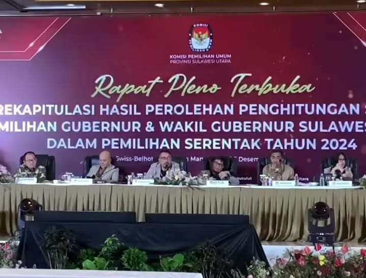 Komisi Pemilihan Umum (KPU) Provinsi Sulawesi Utara menggelar Rapat Pleno Terbuka Rekapitulasi Hasil Perolehan Penghitungan Suara Pemilihan Gubernur dan Wakil Gubernur Sulawesi Utara tahun 2024 hari kedua, Jumat (6/12) bertempat di Hotel SwissBell Manado.
