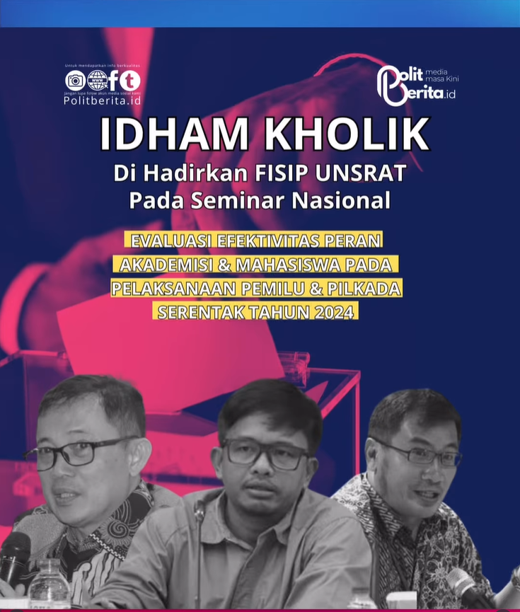 Untuk mendorong pelaksanaan pemilu yang lebih baik dan demokratis, perlu dilakukan evaluasi terhadap pelaksanaan pemilu dan pilkada tahun 2024. Dalam rangka itu, Fakultas Ilmu Sosial dan Ilmu Politik (FISIP) Unsrat akan mengadakan Seminar Nasional dengan tema *Evaluasi Efektivitas Peran Akademisi & Mahasiswa pada Pelaksanaan Pemilu & Pilkada Serentak Tahun 2024*. Seminar ini akan menghadirkan pembicara nasional, Dr. H Idham Holik SE MSi, yang saat ini menjabat sebagai Anggota KPU RI.