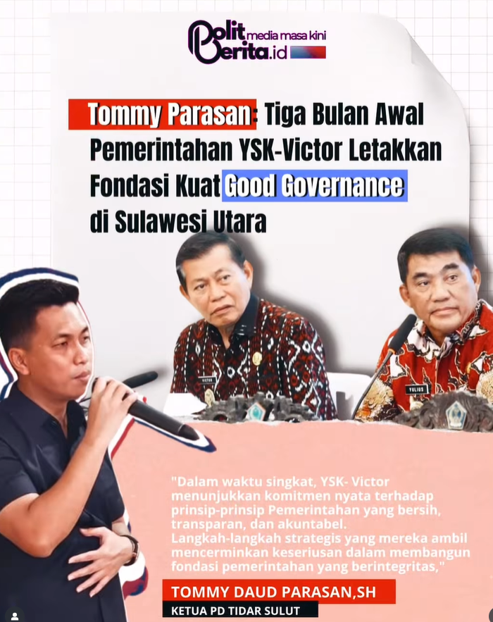 Ketua Pengurus Daerah Tunas Indonesia Raya (TIDAR) Sulawesi Utara, Tommy Parasan, memberikan apresiasi tinggi terhadap kinerja pemerintahan Gubernur Yulius Selvanus Komaling (YSK) dan Wakil Gubernur Victor Mailangkay dalam tiga bulan pertama masa jabatan mereka. Menurut Parasan, pasangan YSK-Victor telah berhasil meletakkan dasar yang kokoh untuk mewujudkan tata kelola pemerintahan yang baik (good governance) di Sulawesi Utara.