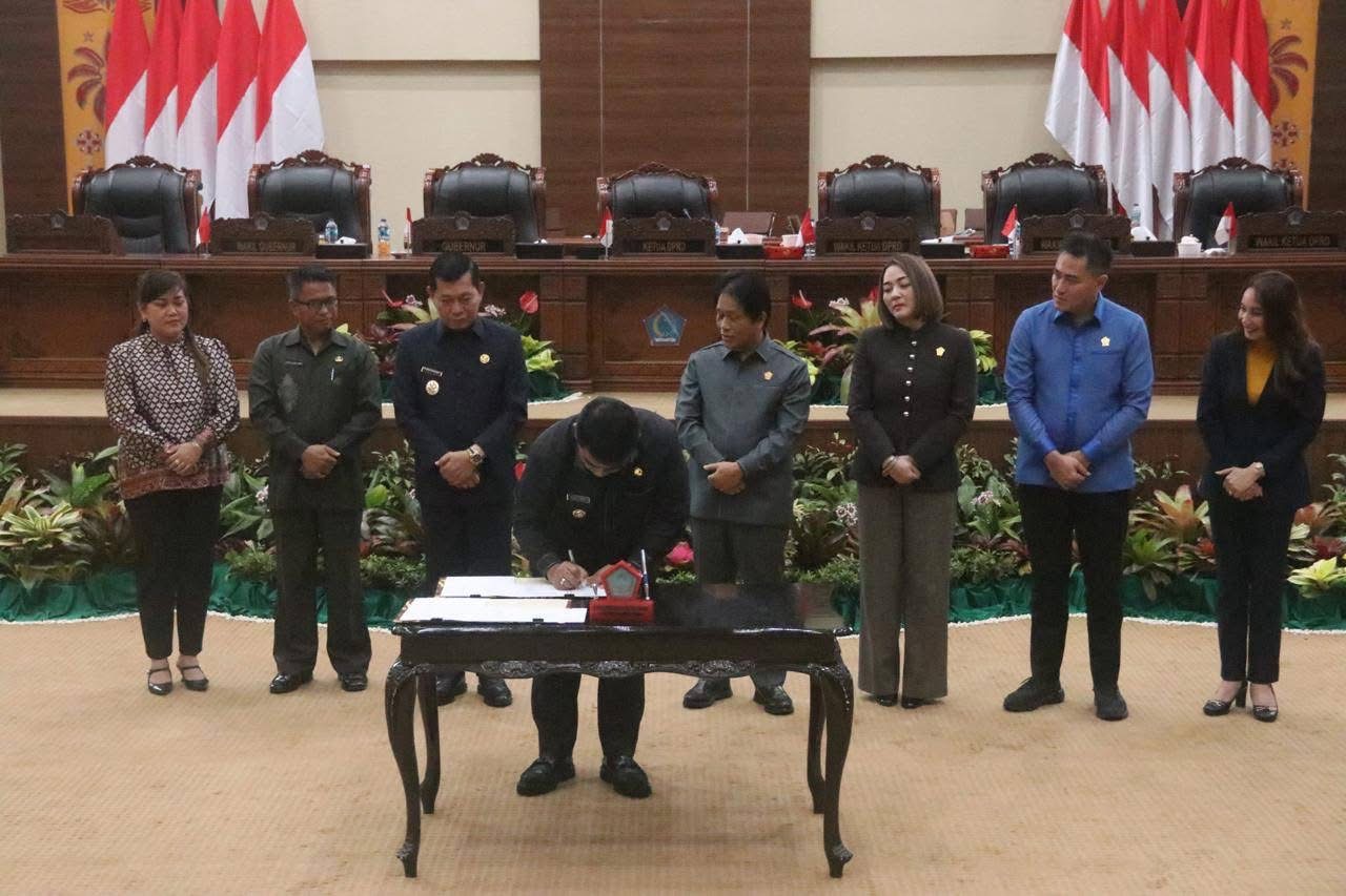 Rapat paripurna kemudian dilanjutkan dengan penandatanganan bersama Propemperda, Ranperda APBD 2026, dan RKT 2026 oleh Gubernur Yulius Selvanus, Wakil Gubernur Victor J. Mailangkay, Ketua DPRD Andi Silangen, serta para wakil ketua DPRD.