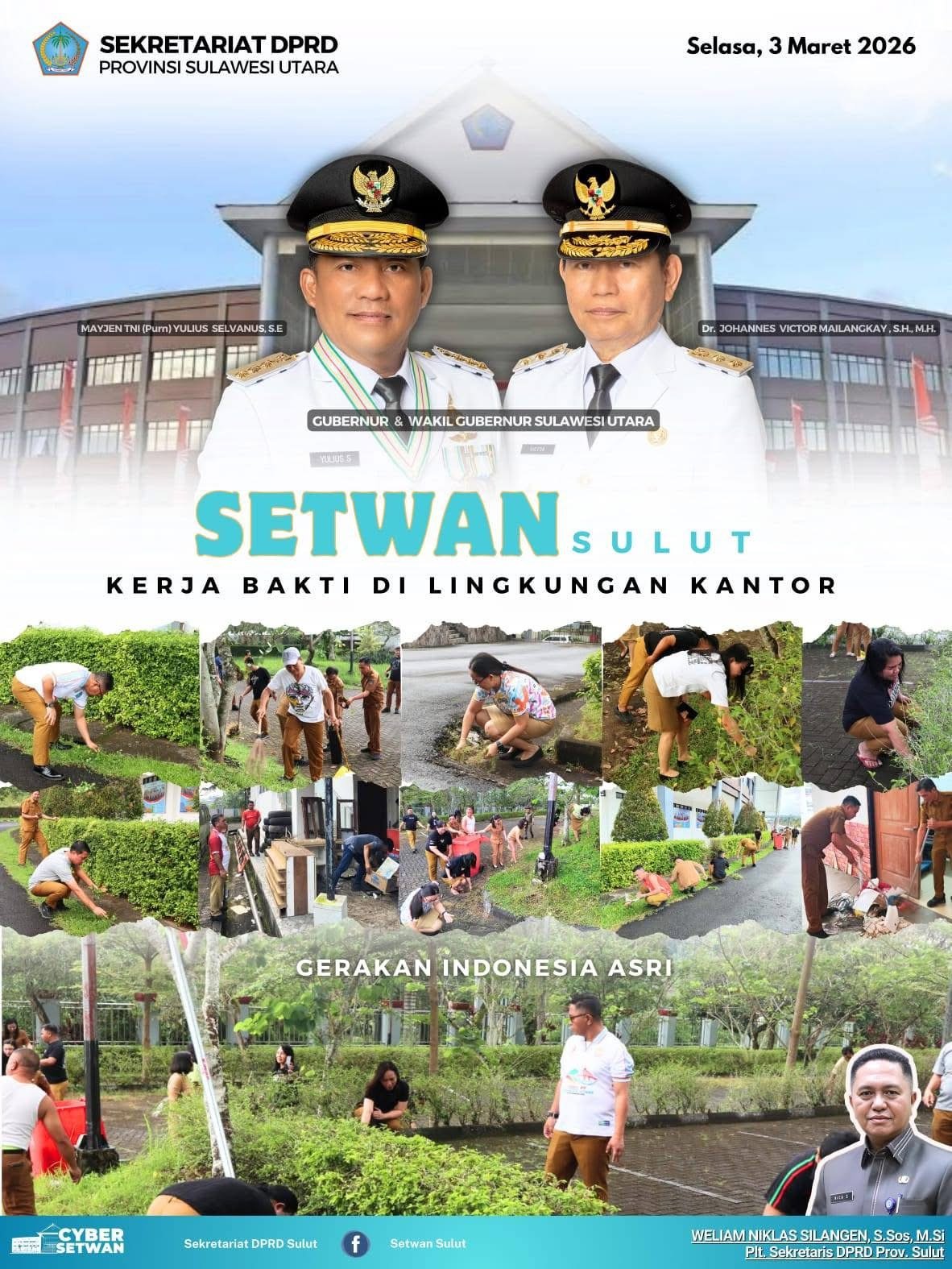Manado – Jajaran Sekretariat Dewan Perwakilan Rakyat Daerah Provinsi Sulawesi Utara melaksanakan kegiatan korve atau kerja bakti di lingkungan kantor, yang dipimpin langsung oleh Pelaksana Tugas Sekretaris DPRD Sulut, Weliam Niklas Silangen.