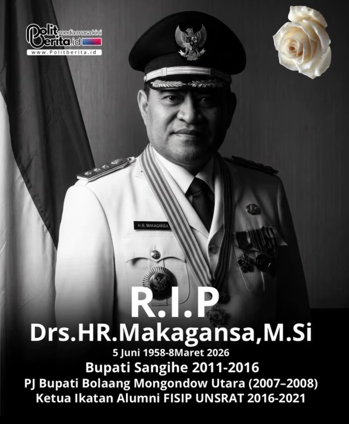 Kabar duka datang dari Kabupaten Kepulauan Sangihe. Tokoh birokrat dan politikus Sulawesi Utara, Hironimus Rompas Makagansa, meninggal dunia hari ini di RSUD Liung Kendage Tahuna.