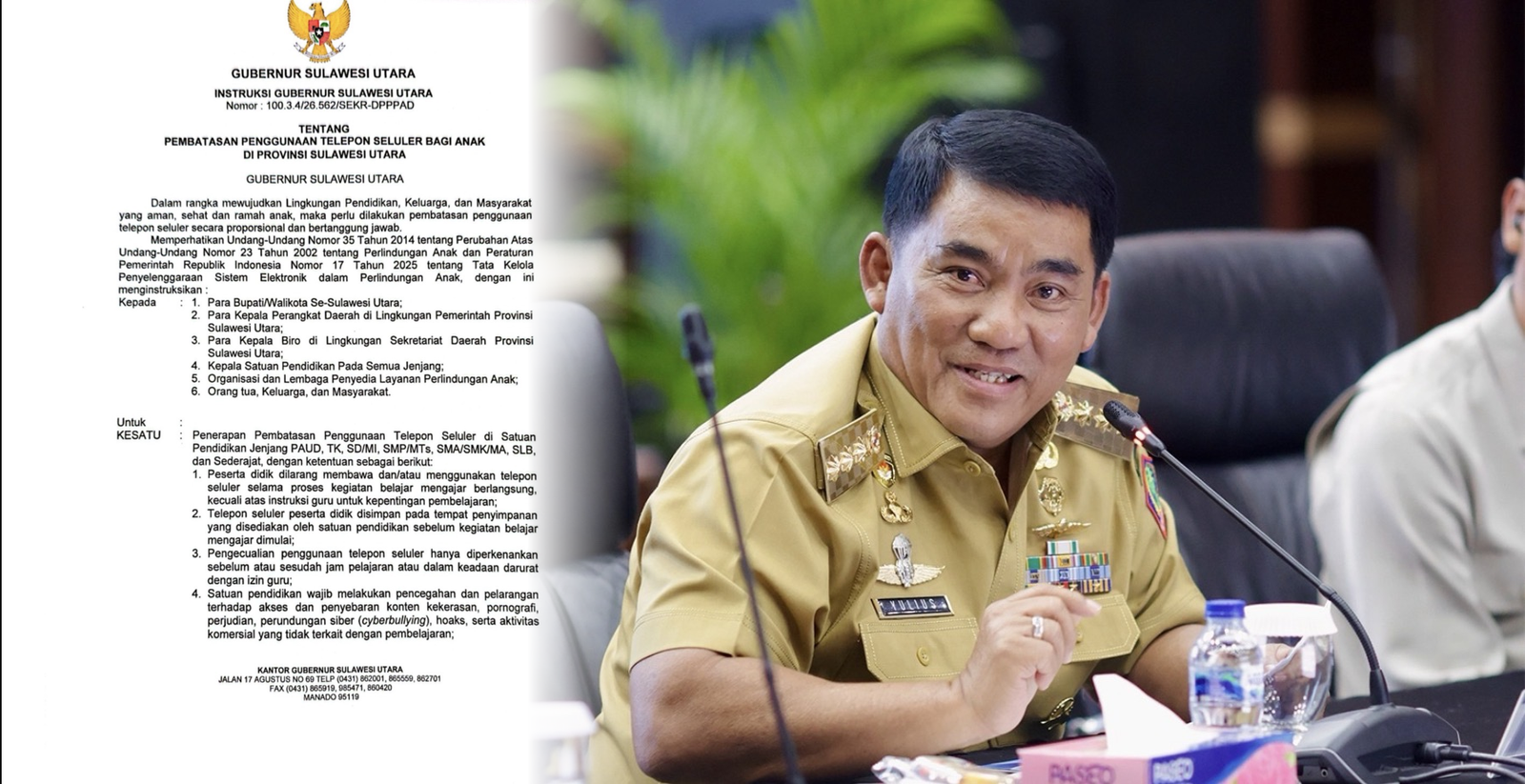Manado – Gubernur Sulawesi Utara Mayjen TNI (Purn) Yulius Selvanus menerbitkan instruksi terkait pembatasan penggunaan telepon seluler bagi anak di lingkungan pendidikan di Provinsi Sulawesi Utara.