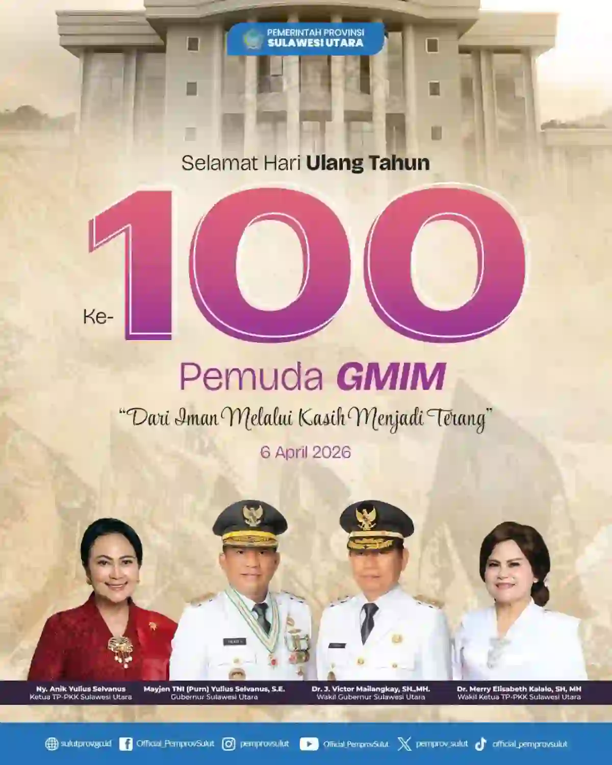 MANADO – Pemerintah Provinsi Sulawesi Utara menyampaikan ucapan selamat atas peringatan Hari Ulang Tahun (HUT) ke-100 Pemuda GMIM yang jatuh pada 6 April 2026. Momentum satu abad ini menjadi tonggak penting dalam perjalanan panjang organisasi kepemudaan gereja di daerah tersebut.
