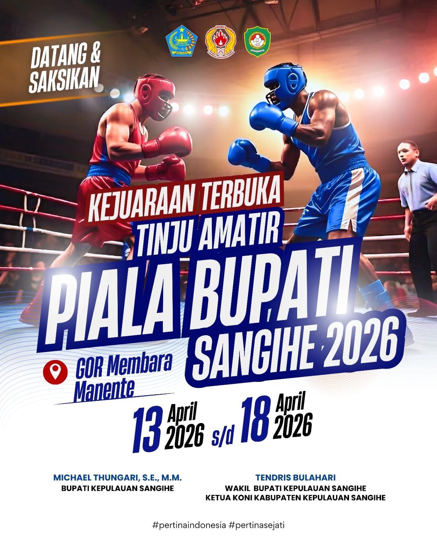 Pemerintah Kabupaten melalui Pemkab Kepulauan Sangihe menggelar ajang bergengsi bertajuk Kejuaraan Terbuka Tinju Amatir Piala Bupati Sangihe 2026. Event ini akan berlangsung pada 13 hingga 18 April 2026.