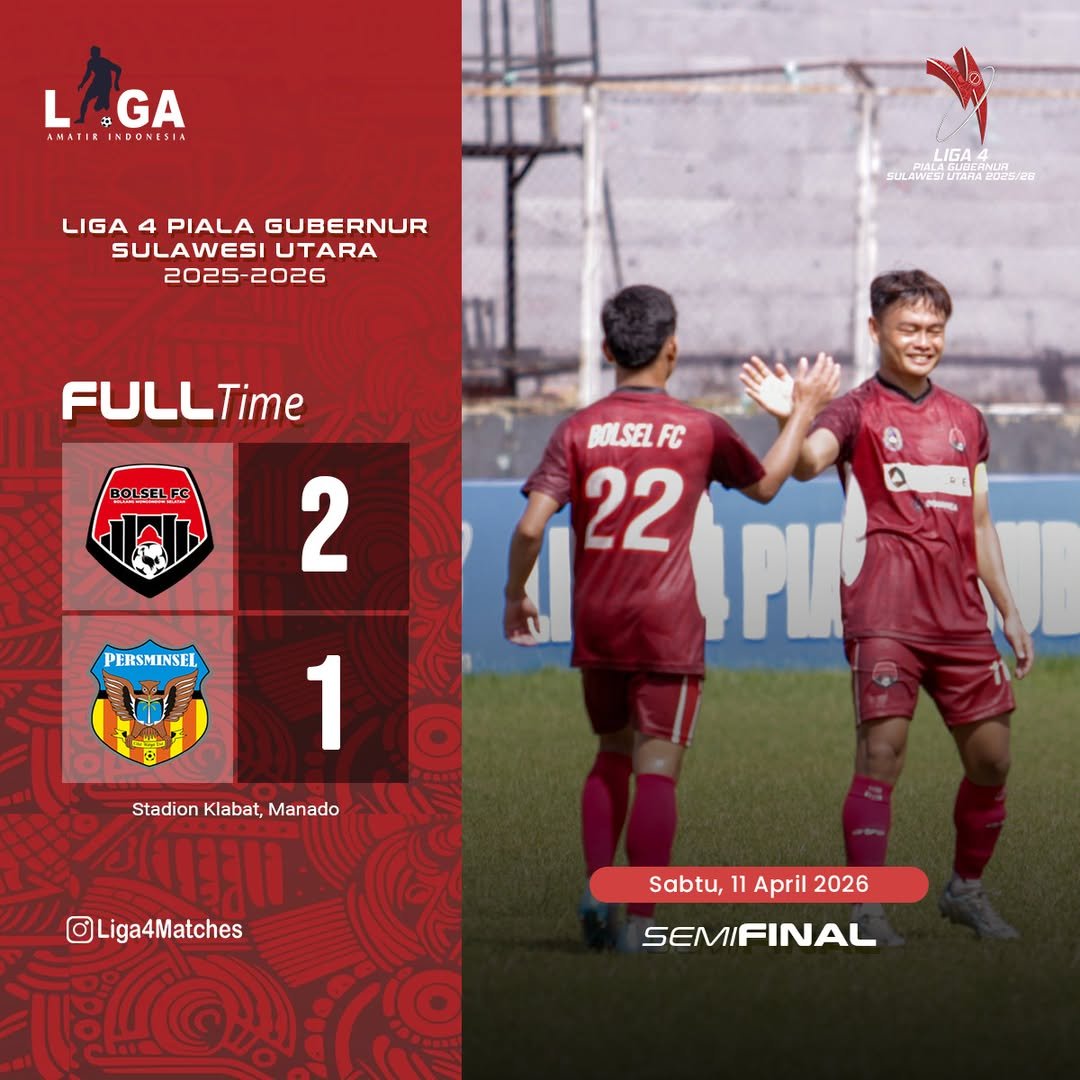 Bolsel FC memastikan diri lolos ke final Liga 4 Piala Gubernur Sulawesi Utara 2025/2026 usai menumbangkan Persminsel Minahasa Selatan dengan skor 2-1 dalam laga semifinal di Stadion Klabat, Sabtu (11/4/2026).